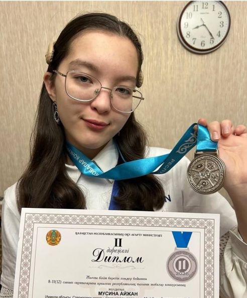 Ученица 10 «В» класса школы-гимназии №6 имени Абая Кунанбаева Мусина Айжан, серебряный призёр Республиканского этапа научно- практической конференции. Руководитель педагог- исследователь, учитель английского языка Акимова Екатерина Вячеславовна