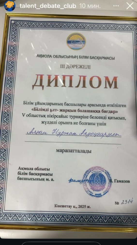 2025 жылы 20-21 қарашада Көкшетау қаласында V облыстық "Біліміді ұлт жарқын болашаққа бағдар" пікірсайыс турнирінде Степногорск қаласы құрамасы жүлделі ІІІ орын иеленді. Команда құрамы Ю. А. Гагарин атындағы №7 мектеп басшысы Базарбекова Асель Какимбековна және Абай Құнанбайұлы атындағы №6 мектеп-гимназия басшысы Аяған Нұржан Алдоңғарұлы.